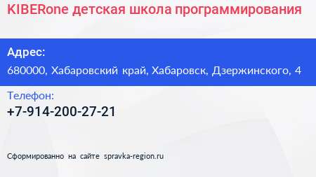 KIBERone, детская школа программирования по адресу 680000, Хабаровский край, Хабаровск, Дзержинского, 4 в дальнейшем Организация, размещена в следующих категориях: