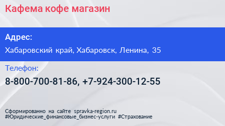 Кафема, кофе-магазин по адресу Хабаровский край, Хабаровск, Ленина, 35 в дальнейшем Организация, размещена в следующих категориях: