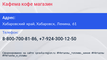 Кафема, кофе-магазин по адресу Хабаровский край, Хабаровск, Ленина, 61 в дальнейшем Организация, размещена в следующих категориях: