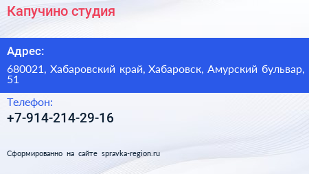 Капучино, студия по адресу 680021, Хабаровский край, Хабаровск, Амурский бульвар, 51 в дальнейшем Организация, размещена в следующих категориях: