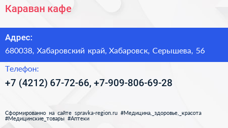 Караван, кафе по адресу 680038, Хабаровский край, Хабаровск, Серышева, 56 в дальнейшем Организация, размещена в следующих категориях:
