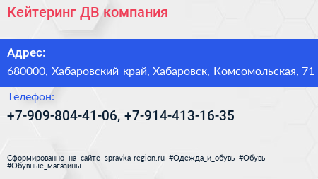 Кейтеринг-ДВ, компания по адресу 680000, Хабаровский край, Хабаровск, Комсомольская, 71 в дальнейшем Организация, размещена в следующих категориях: