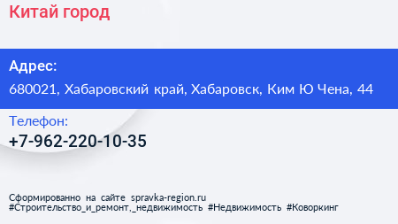 Китай-город по адресу 680021, Хабаровский край, Хабаровск, Ким Ю Чена, 44 в дальнейшем Организация, размещена в следующих категориях: