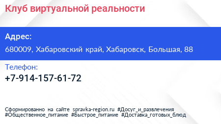Клуб виртуальной реальности по адресу 680009, Хабаровский край, Хабаровск, Большая, 88 в дальнейшем Организация, размещена в следующих категориях: