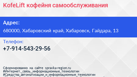 KofeLift, кофейня самообслуживания по адресу 680000, Хабаровский край, Хабаровск, Гайдара, 13 в дальнейшем Организация, размещена в следующих категориях: