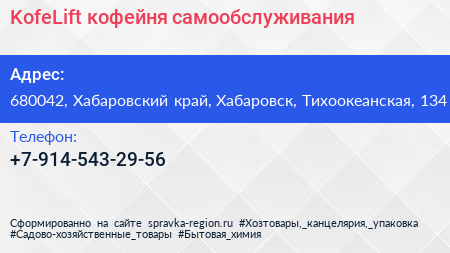 KofeLift, кофейня самообслуживания по адресу 680042, Хабаровский край, Хабаровск, Тихоокеанская, 134 в дальнейшем Организация, размещена в следующих категориях: