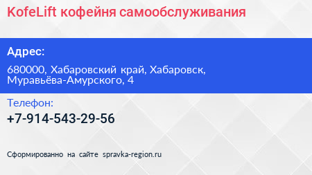 KofeLift, кофейня самообслуживания по адресу 680000, Хабаровский край, Хабаровск, Муравьёва-Амурского, 4 в дальнейшем Организация, размещена в следующих категориях: