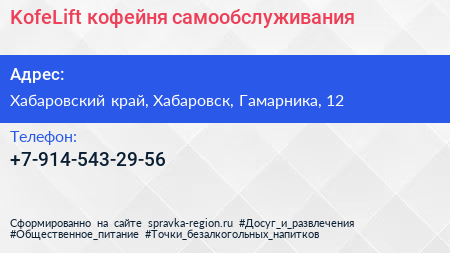 KofeLift, кофейня самообслуживания по адресу Хабаровский край, Хабаровск, Гамарника, 12 в дальнейшем Организация, размещена в следующих категориях: