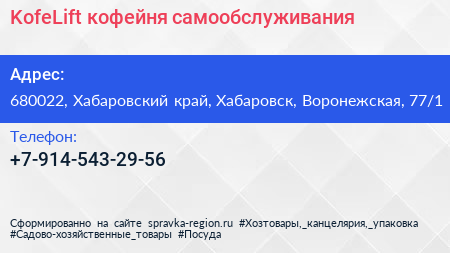 KofeLift, кофейня самообслуживания по адресу 680022, Хабаровский край, Хабаровск, Воронежская, 77/1 в дальнейшем Организация, размещена в следующих категориях: