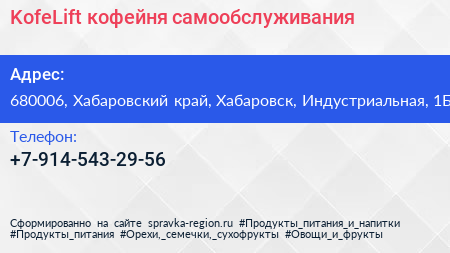 KofeLift, кофейня самообслуживания по адресу 680006, Хабаровский край, Хабаровск, Индустриальная, 1Б в дальнейшем Организация, размещена в следующих категориях: