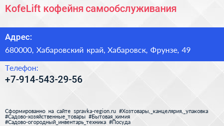 KofeLift, кофейня самообслуживания по адресу 680000, Хабаровский край, Хабаровск, Фрунзе, 49 в дальнейшем Организация, размещена в следующих категориях: