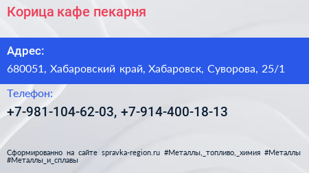 Корица, кафе-пекарня по адресу 680051, Хабаровский край, Хабаровск, Суворова, 25/1 в дальнейшем Организация, размещена в следующих категориях: