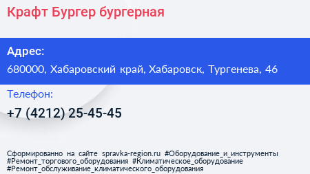 Крафт Бургер, бургерная по адресу 680000, Хабаровский край, Хабаровск, Тургенева, 46 в дальнейшем Организация, размещена в следующих категориях: