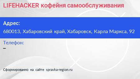 LIFEHACKER, кофейня самообслуживания по адресу 680013, Хабаровский край, Хабаровск, Карла Маркса, 92 в дальнейшем Организация, размещена в следующих категориях: