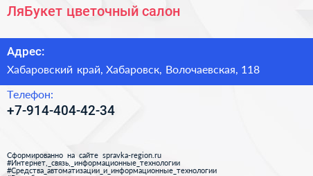 ЛяБукет, цветочный салон по адресу Хабаровский край, Хабаровск, Волочаевская, 118 в дальнейшем Организация, размещена в следующих категориях: