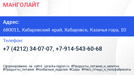 МАНГОЛАЙТ по адресу 680011, Хабаровский край, Хабаровск, Казачья гора, 10 в дальнейшем Организация, размещена в следующих категориях: