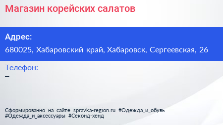 Магазин корейских салатов по адресу 680025, Хабаровский край, Хабаровск, Сергеевская, 26 в дальнейшем Организация, размещена в следующих категориях: