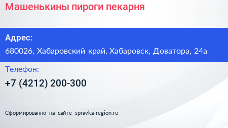 Машенькины пироги, пекарня по адресу 680026, Хабаровский край, Хабаровск, Доватора, 24а в дальнейшем Организация, размещена в следующих категориях: