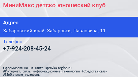 МиниМакс, детско-юношеский клуб по адресу Хабаровский край, Хабаровск, Павловича, 11 в дальнейшем Организация, размещена в следующих категориях: