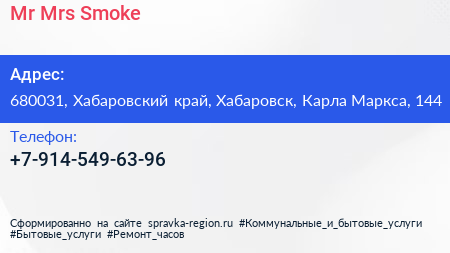 Mr & Mrs Smoke по адресу 680031, Хабаровский край, Хабаровск, Карла Маркса, 144 в дальнейшем Организация, размещена в следующих категориях: