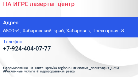 НА ИГРЕ, лазертаг-центр по адресу 680054, Хабаровский край, Хабаровск, Трёхгорная, 8 в дальнейшем Организация, размещена в следующих категориях: