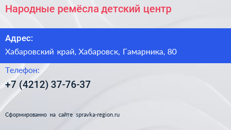 Народные ремёсла, детский центр по адресу Хабаровский край, Хабаровск, Гамарника, 80 в дальнейшем Организация, размещена в следующих категориях: