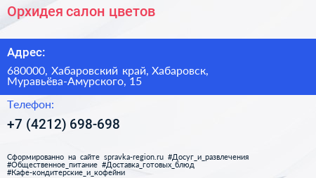 Орхидея, салон цветов по адресу 680000, Хабаровский край, Хабаровск, Муравьёва-Амурского, 15 в дальнейшем Организация, размещена в следующих категориях: