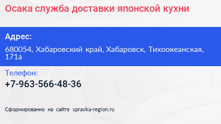 Осака, служба доставки японской кухни по адресу 680054, Хабаровский край, Хабаровск, Тихоокеанская, 171а в дальнейшем Организация, размещена в следующих категориях: