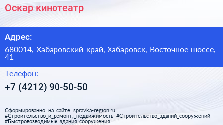 Оскар, кинотеатр по адресу 680014, Хабаровский край, Хабаровск, Восточное шоссе, 41 в дальнейшем Организация, размещена в следующих категориях: