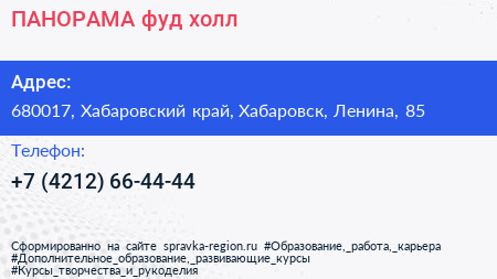 ПАНОРАМА, фуд-холл по адресу 680017, Хабаровский край, Хабаровск, Ленина, 85 в дальнейшем Организация, размещена в следующих категориях: