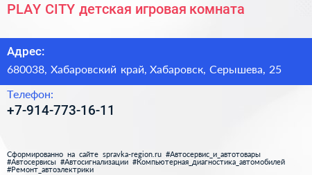 PLAY CITY, детская игровая комната по адресу 680038, Хабаровский край, Хабаровск, Серышева, 25 в дальнейшем Организация, размещена в следующих категориях: