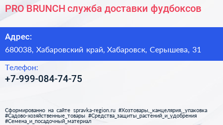 PRO BRUNCH, служба доставки фудбоксов по адресу 680038, Хабаровский край, Хабаровск, Серышева, 31 в дальнейшем Организация, размещена в следующих категориях: