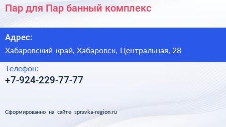Пар для Пар, банный комплекс по адресу Хабаровский край, Хабаровск, Центральная, 28 в дальнейшем Организация, размещена в следующих категориях: