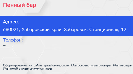Пенный бар по адресу 680021, Хабаровский край, Хабаровск, Станционная, 12 в дальнейшем Организация, размещена в следующих категориях: