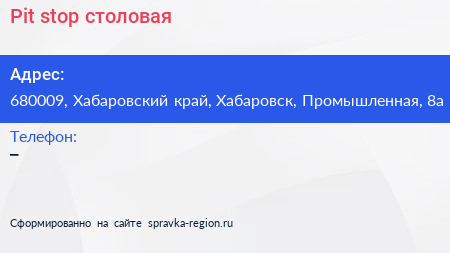 Pit stop, столовая по адресу 680009, Хабаровский край, Хабаровск, Промышленная, 8а в дальнейшем Организация, размещена в следующих категориях: