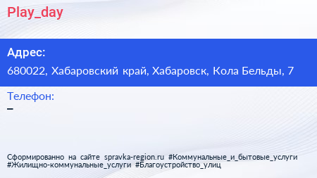 Play_day по адресу 680022, Хабаровский край, Хабаровск, Кола Бельды, 7 в дальнейшем Организация, размещена в следующих категориях: