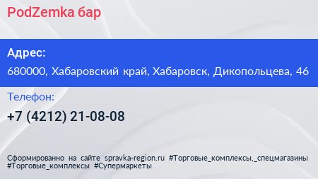 PodZemka, бар по адресу 680000, Хабаровский край, Хабаровск, Дикопольцева, 46 в дальнейшем Организация, размещена в следующих категориях: