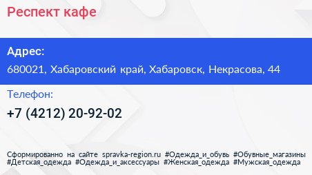 Респект, кафе по адресу 680021, Хабаровский край, Хабаровск, Некрасова, 44 в дальнейшем Организация, размещена в следующих категориях:
