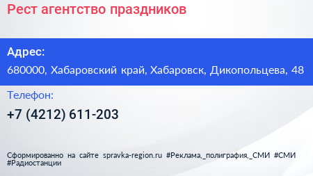 Рест, агентство праздников по адресу 680000, Хабаровский край, Хабаровск, Дикопольцева, 48 в дальнейшем Организация, размещена в следующих категориях: