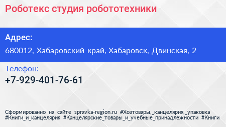 Роботекс, студия робототехники по адресу 680012, Хабаровский край, Хабаровск, Двинская, 2 в дальнейшем Организация, размещена в следующих категориях: