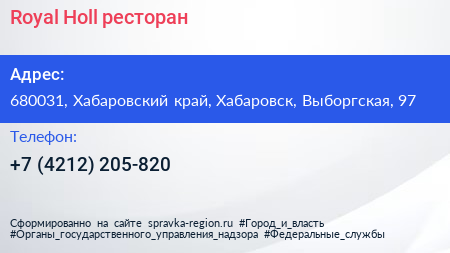 Royal Holl, ресторан по адресу 680031, Хабаровский край, Хабаровск, Выборгская, 97 в дальнейшем Организация, размещена в следующих категориях: