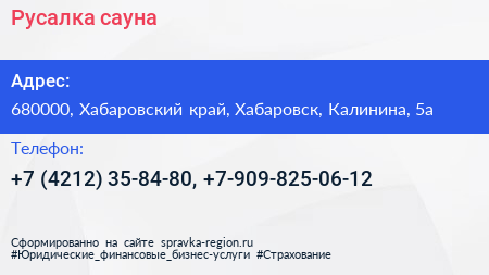 Русалка, сауна по адресу 680000, Хабаровский край, Хабаровск, Калинина, 5а в дальнейшем Организация, размещена в следующих категориях: