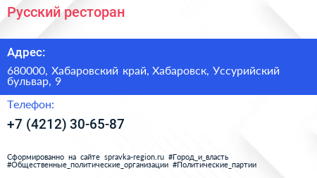 Русский, ресторан по адресу 680000, Хабаровский край, Хабаровск, Уссурийский бульвар, 9 в дальнейшем Организация, размещена в следующих категориях: