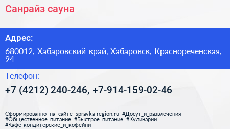 Санрайз, сауна по адресу 680012, Хабаровский край, Хабаровск, Краснореченская, 94 в дальнейшем Организация, размещена в следующих категориях: