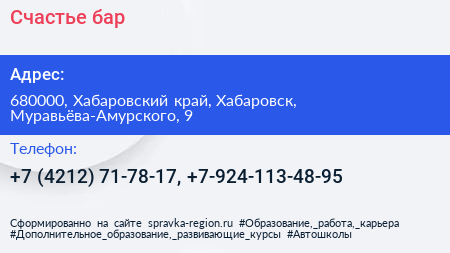 Счастье, бар по адресу 680000, Хабаровский край, Хабаровск, Муравьёва-Амурского, 9 в дальнейшем Организация, размещена в следующих категориях: