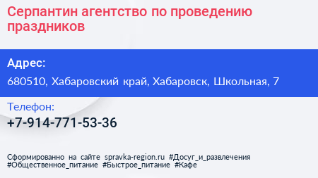 Серпантин, агентство по проведению праздников по адресу 680510, Хабаровский край, Хабаровск, Школьная, 7 в дальнейшем Организация, размещена в следующих категориях: