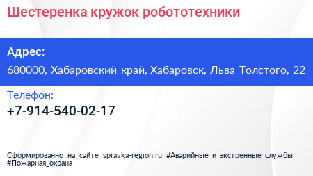 Шестеренка, кружок робототехники по адресу 680000, Хабаровский край, Хабаровск, Льва Толстого, 22 в дальнейшем Организация, размещена в следующих категориях: