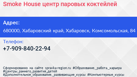 Smoke House, центр паровых коктейлей по адресу 680000, Хабаровский край, Хабаровск, Комсомольская, 84 в дальнейшем Организация, размещена в следующих категориях: