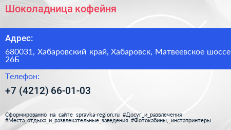 Шоколадница, кофейня по адресу 680031, Хабаровский край, Хабаровск, Матвеевское шоссе, 26Б в дальнейшем Организация, размещена в следующих категориях: