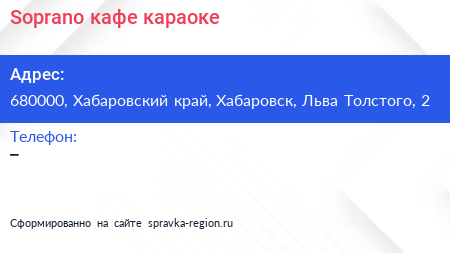 Soprano, кафе-караоке по адресу 680000, Хабаровский край, Хабаровск, Льва Толстого, 2 в дальнейшем Организация, размещена в следующих категориях: